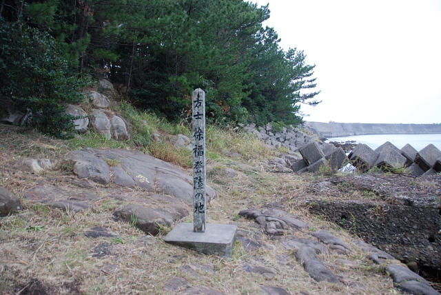 「方士 徐福登陸の地」 赤い橋を渡り,海岸沿いに右に少し歩いたところに「方士 徐福登陸の地」と書かれた石碑があります。徐福がここに上陸したことを示しています。地図